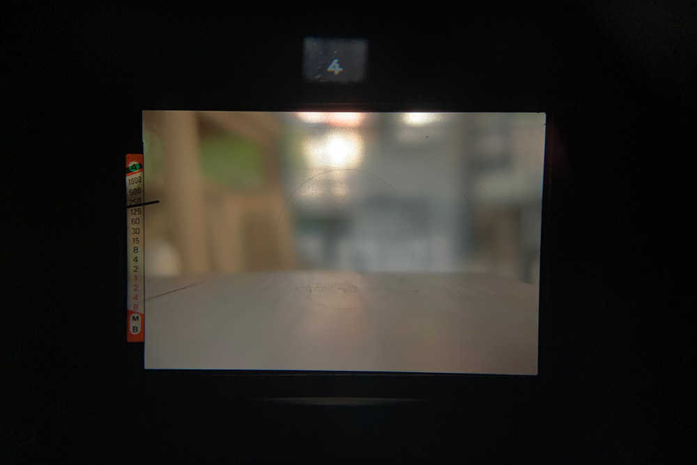 ในช่องมองภาพจะมีเข็มชี้ค่าความเร็วชัตเตอร์ (เข็มสีเขียวบอกว่าตอนนี้เราปรับความเร็วชัตเตอร์ไว้ที่เท่าไหร่ เข็มเล็กๆสีดำบอกความเร็วชัดเตอร์ควรจะเป็นเท่าไหร่) และช่องสะท้อนค่ารูรับแสงจากที่ตัวเลนส์ เนื่องด้วยความที่เป็นเข็มเวลากลางคืนหรืออยู่ที่มืดๆเลยแอบมองยากนิดหน่อย แต่ก็ไม่ใช่ปัญหาอะไรมาก
